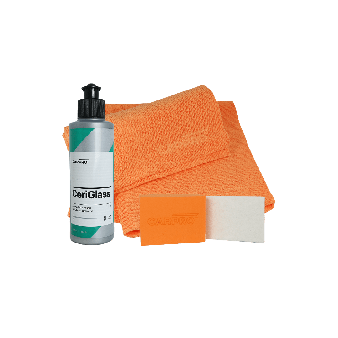 CeriGlass is a unique glass polishing system developed by the innovative technique of blending special ceramics together with other nano components and mild abrasives to create the most user friendly and still effective glass polishing system! It quickly removes acid rain spots, hard water spots, road film, and stubborn bird stains. It is also capable of removing fine to medium windshield wiper/grit scratches and swirls! And it does all this without warping the glass.